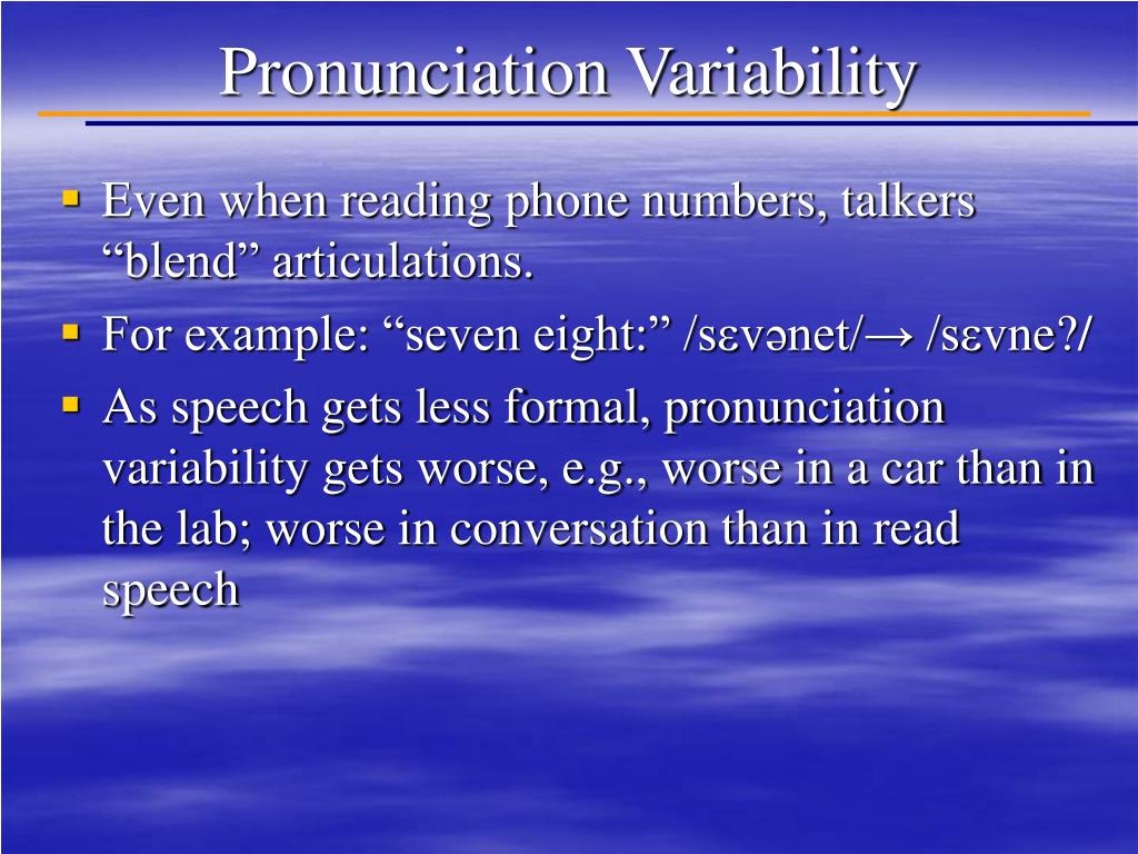 Pronunciation Variability • Even when reading phone numbers, talkers “blend” articulations. • For example: “seven eight:” /sevәnet/→ /sevne?/ • As speech gets less formal, pronunciation variability gets worse, e.g., worse in a car than in the lab; worse in conversation than in read speech