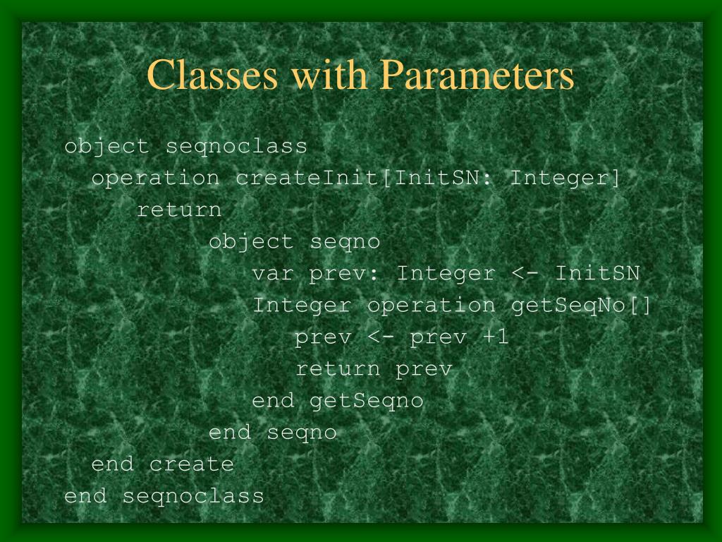 Classes with Parameters object seqnoclass operation createInit[InitSN: Integer] return object seqno var prev: Integer <- InitSN Integer operation getSeqNo[] prev <- prev +1 return prev end getSeqno end seqno end create end seqnoclass