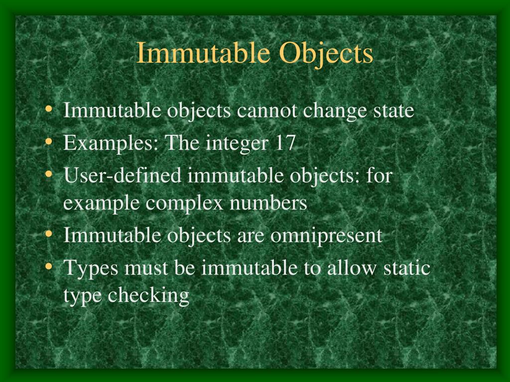 Immutable Objects • Immutable objects cannot change state • Examples: The integer 17 • User-defined immutable objects: for example complex numbers • Immutable objects are omnipresent • Types must be immutable to allow static type checking