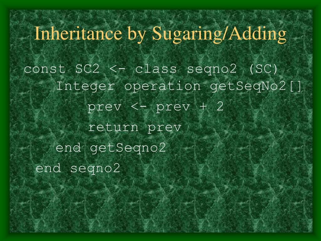 Inheritance by Sugaring/Adding const SC2 <- class seqno2 (SC) Integer operation getSeqNo2[] prev <- prev + 2 return prev end getSeqno2 end seqno2