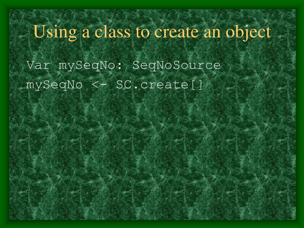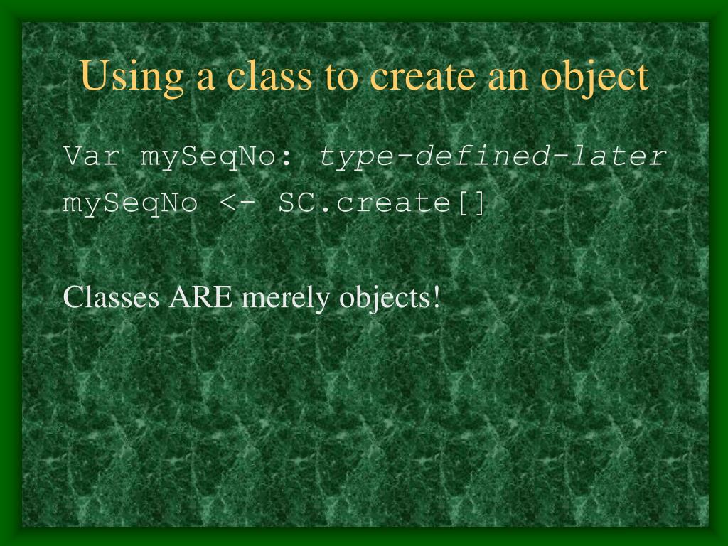Using a class to create an object Var mySeqNo: type-defined-later mySeqNo <- SC.create[] Classes ARE merely objects!