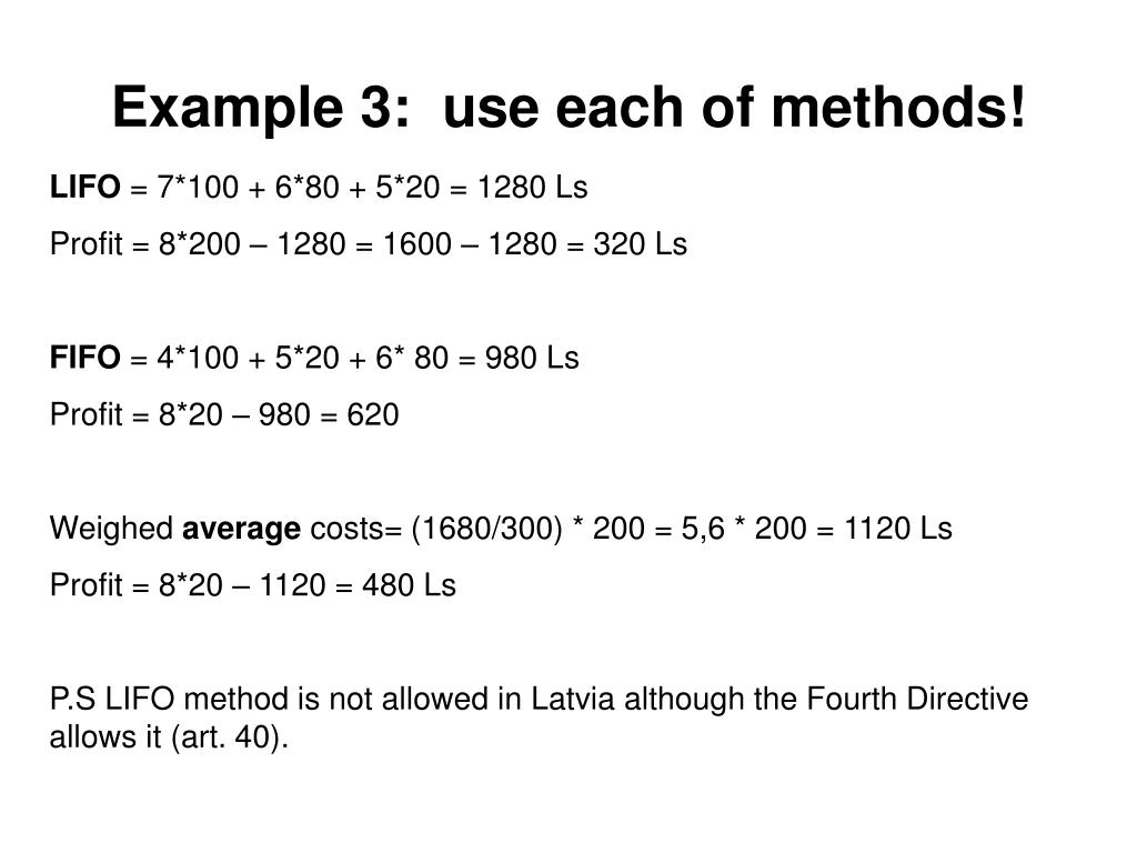 Example 3: use each of methods! LIFO = 7*100 + 6*80 + 5*20 = 1280 Ls Profit = 8*200 – 1280 = 1600 – 1280 = 320 Ls FIFO = 4*100 + 5*20 + 6* 80 = 980 Ls Profit = 8*20 – 980 = 620 Weighed average costs= (1680/300) * 200 = 5,6 * 200 = 1120 Ls Profit = 8*20 – 1120 = 480 Ls P.S LIFO method is not allowed in Latvia although the Fourth Directive allows it (art. 40).