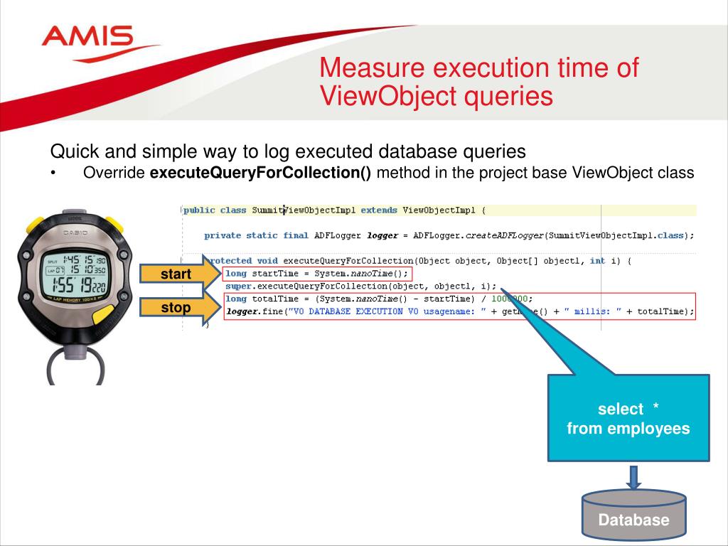 Measure execution time of ViewObject queries Quick and simple way to log executed database queries • Override executeQueryForCollection() methodin the project base ViewObject class start stop select * from employees Database