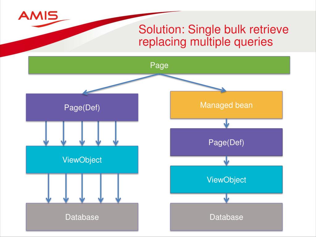 Solution: Single bulk retrieve replacing multiple queries Page Managed bean Page(Def) Page(Def) ViewObject ViewObject Database Database