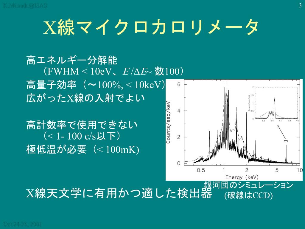 K.Mitsuda@ISAS X線マイクロカロリメータ 高エネルギー分解能(FWHM < 10eV、/D~ 数100) 高量子効率(〜100%, < 10keV) 広がったX線の入射でよい 高計数率で使用できない(< 1- 100 c/s以下) 極低温が必要(< 100mK) X線天文学に有用かつ適した検出器 銀河団のシミュレーション (破線はCCD)