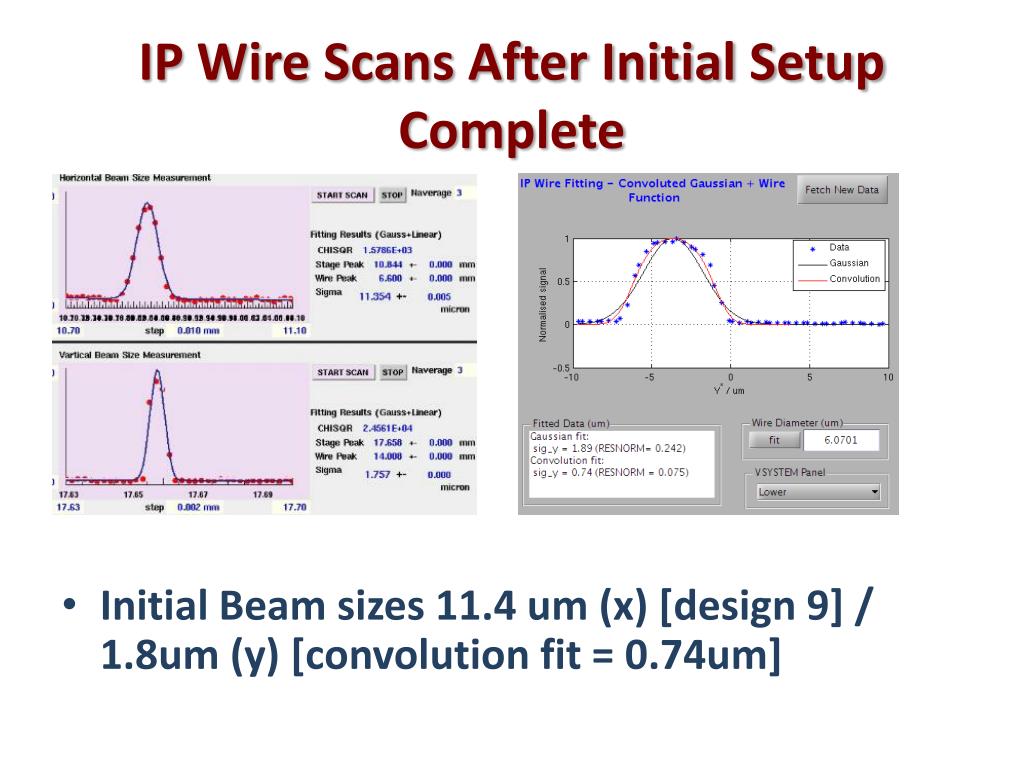 IP Wire Scans After Initial Setup Complete Initial Beam sizes 11.4 um (x) [design 9] / 1.8um (y) [convolution fit = 0.74um]