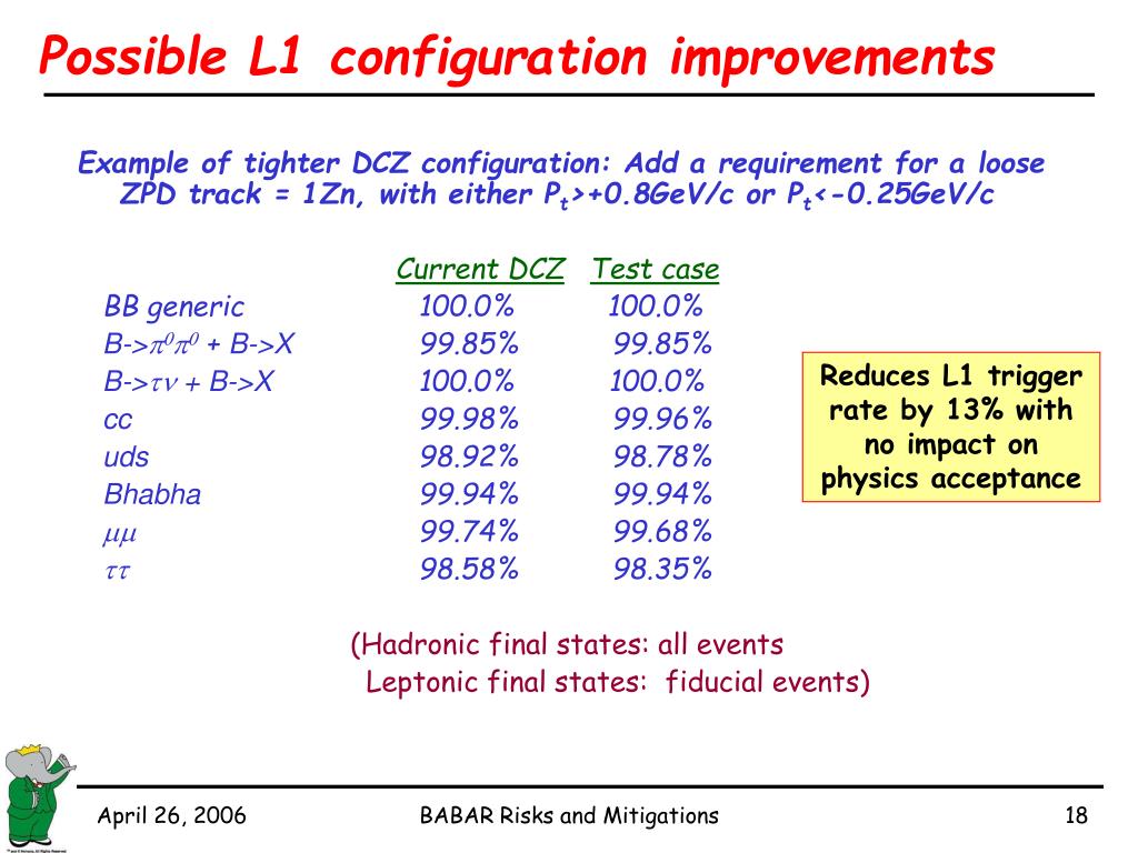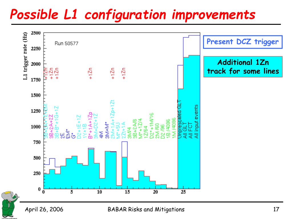 Possible L1 configuration improvements Present DCZ trigger Additional 1Zn track for some lines BABAR Risks and Mitigations