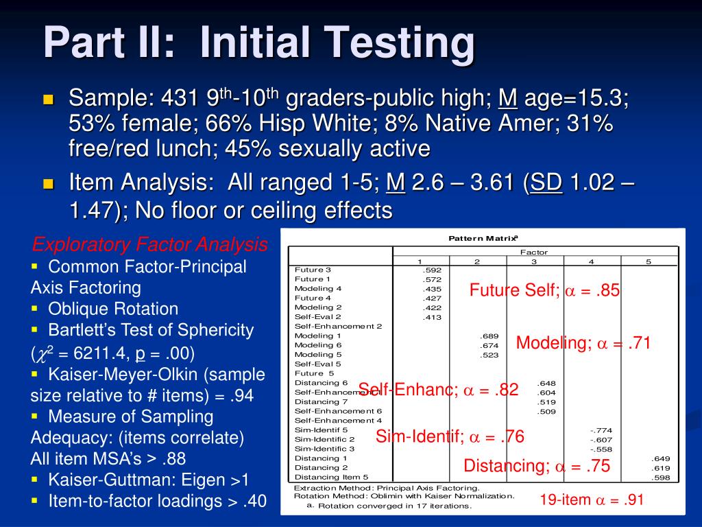 Part II: Initial Testing • Sample: 431 9th-10th graders-public high; M age=15.3; 53% female; 66% Hisp White; 8% Native Amer; 31% free/red lunch; 45% sexually active • Item Analysis: All ranged 1-5; M 2.6 – 3.61 (SD 1.02 – 1.47); No floor or ceiling effects • Exploratory Factor Analysis • Common Factor-Principal Axis Factoring • Oblique Rotation • Bartlett’s Test of Sphericity (c2 = 6211.4, p = .00) • Kaiser-Meyer-Olkin (sample size relative to # items) = .94 • Measure of Sampling Adequacy: (items correlate) All item MSA’s > .88 • Kaiser-Guttman: Eigen >1 • Item-to-factor loadings > .40 Future Self; a = .85 Modeling; a = .71 Self-Enhanc; a = .82 Sim-Identif; a = .76 Distancing; a = .75 19-item a = .91