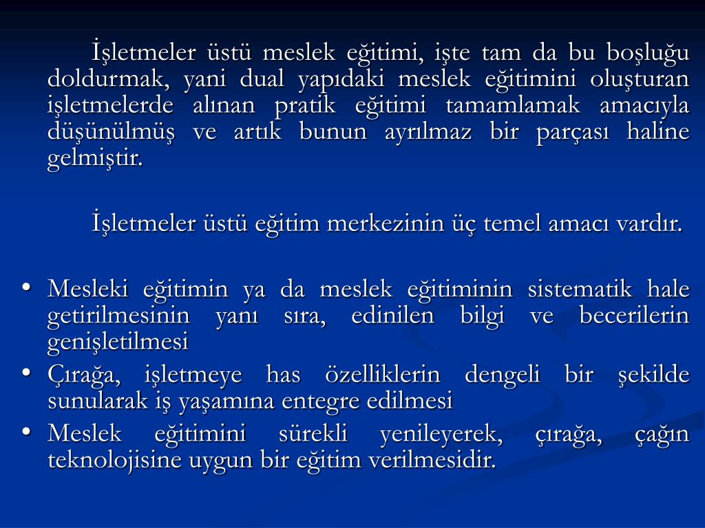 İşletmeler üstü meslek eğitimi, işte tam da bu boşluğu doldurmak, yani dual yapıdaki meslek eğitimini oluşturan işletmelerde alınan pratik eğitimi tamamlamak amacıyla düşünülmüş ve artık bunun ayrılmaz bir parçası haline gelmiştir. İşletmeler üstü eğitim merkezinin üç temel amacı vardır. • Mesleki eğitimin ya da meslek eğitiminin sistematik hale getirilmesinin yanı sıra, edinilen bilgi ve becerilerin genişletilmesi • Çırağa, işletmeye has özelliklerin dengeli bir şekilde sunularak iş yaşamına entegre edilmesi • Meslek eğitimini sürekli yenileyerek, çırağa, çağın teknolojisine uygun bir eğitim verilmesidir.