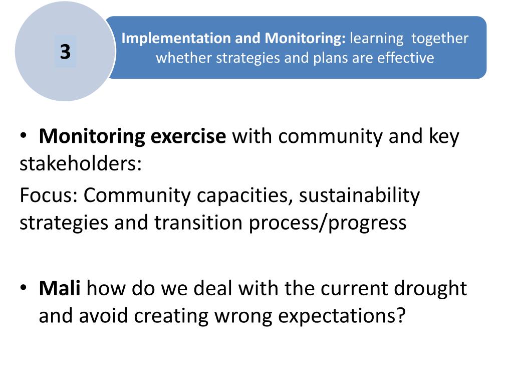 Implementation and Monitoring: learning together whether strategies and plans are effective 3 • Monitoring exercise with community and key stakeholders: Focus: Community capacities, sustainability strategies and transition process/progress • Mali how do we deal with the current drought and avoid creating wrong expectations?