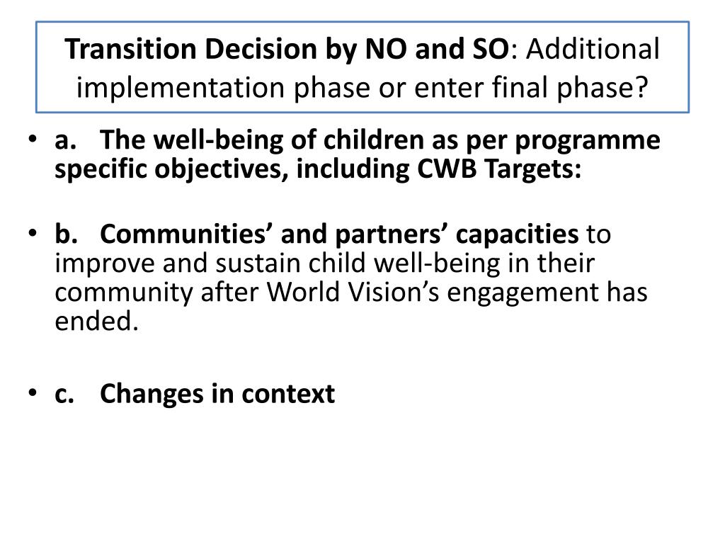 Transition Decision by NO and SO: Additional implementation phase or enter final phase? • a. The well-being of children as per programme specific objectives, including CWB Targets: • b. Communities’ and partners’ capacities to improve and sustain child well-being in their community after World Vision’s engagement has ended. • c. Changes in context