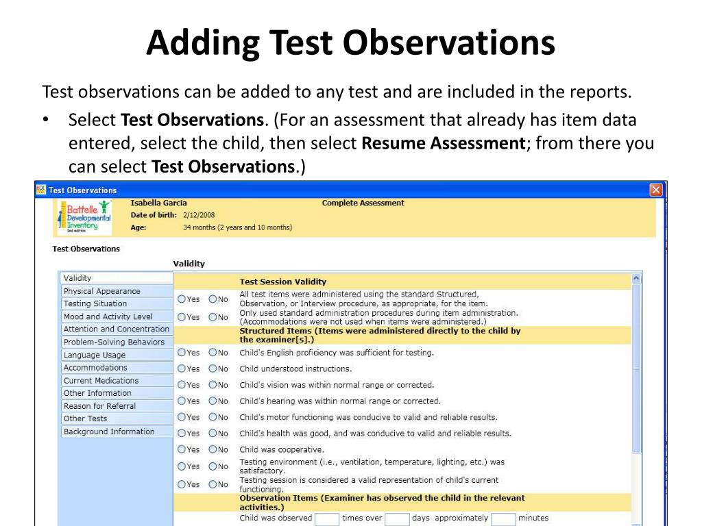 Adding Test Observations Test observations can be added to any test and are included in the reports. • Select Test Observations. (For an assessment that already has item data entered, select the child, then select Resume Assessment; from there you can select Test Observations.)