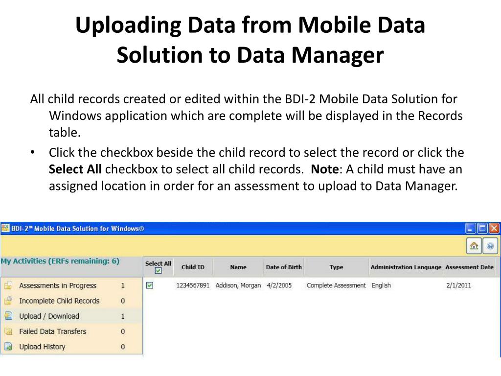 Uploading Data from Mobile Data Solution to Data Manager All child records created or edited within the BDI-2 Mobile Data Solution for Windows application which are complete will be displayed in the Records table. • Click the checkbox beside the child record to select the record or click the Select All checkbox to select all child records. Note: A child must have an assigned location in order for an assessment to upload to Data Manager.