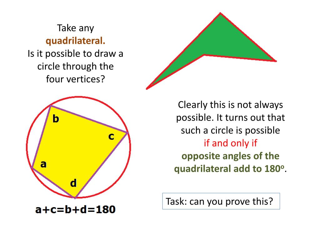 Take any quadrilateral. Is it possible to draw a circle through the four vertices? Clearly this is not always possible. It turns out that such a circle is possible if and only if opposite angles of the quadrilateral add to 180o. Task: can you prove this?
