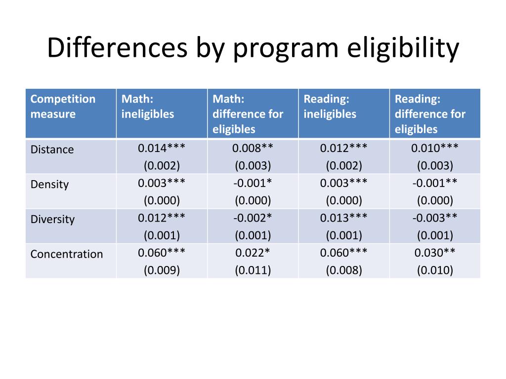 Differences by context (reading; distance measure of competition)