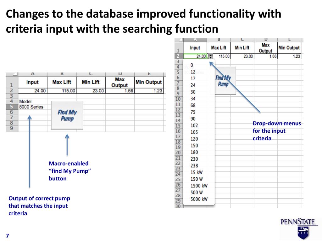 Changes to the database improved functionality with criteria input with the searching function Drop-down menus for the input criteria Macro-enabled “find My Pump” button Output of correct pump that matches the input criteria