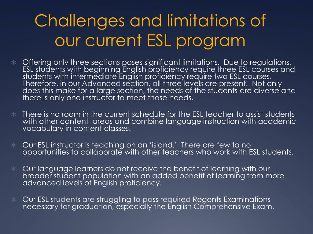 Challenges and limitations of our current ESL program • Offering only three sections poses significant limitations. Due to regulations, ESL students with beginning English proficiency require three ESL courses and students with intermediate English proficiency require two ESL courses. Therefore, in our Advanced section, all three levels are present. Not only does this make for a large section, the needs of the students are diverse and there is only one instructor to meet those needs. • There is no room in the current schedule for the ESL teacher to assist students with other content areas and combine language instruction with academic vocabulary in content classes. • Our ESL instructor is teaching on an ‘island.’ There are few to no opportunities to collaborate with other teachers who work with ESL students. • Our language learners do not receive the benefit of learning with our broader student population with an added benefit of learning from more advanced levels of English proficiency. • Our ESL students are struggling to pass required Regents Examinations necessary for graduation, especially the English Comprehensive Exam.