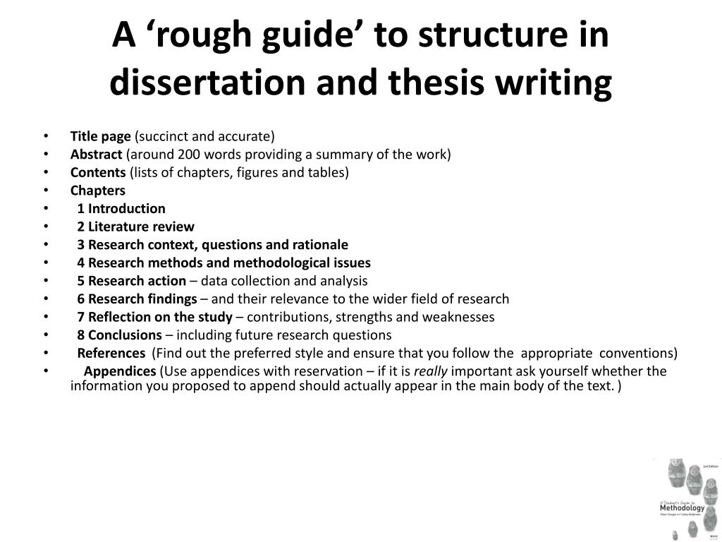 A ‘rough guide’ to structure in dissertation and thesis writing • Title page (succinct and accurate) • Abstract (around 200 words providing a summary of the work) • Contents (lists of chapters, figures and tables) • Chapters • 1 Introduction • 2 Literature review • 3 Research context, questions and rationale • 4 Research methods and methodological issues • 5 Research action – data collection and analysis • 6 Research findings – and their relevance to the wider field of research • 7 Reflection on the study – contributions, strengths and weaknesses • 8 Conclusions – including future research questions • References (Find out the preferred style and ensure that you follow the appropriate conventions) • Appendices (Use appendices with reservation – if it is really important ask yourself whether the information you proposed to append should actually appear in the main body of the text.)