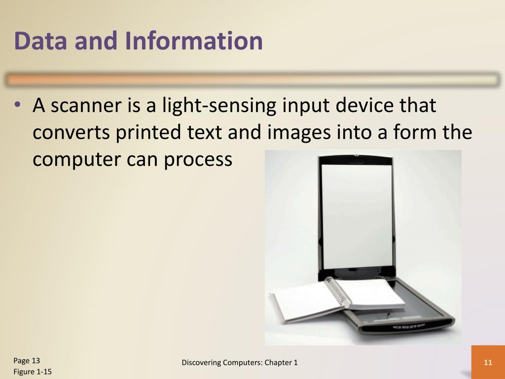 Data and Information • A scanner is a light-sensing input device that converts printed text and images into a form the computer can process Discovering Computers: Chapter 1 Page 13 Figure 1-15