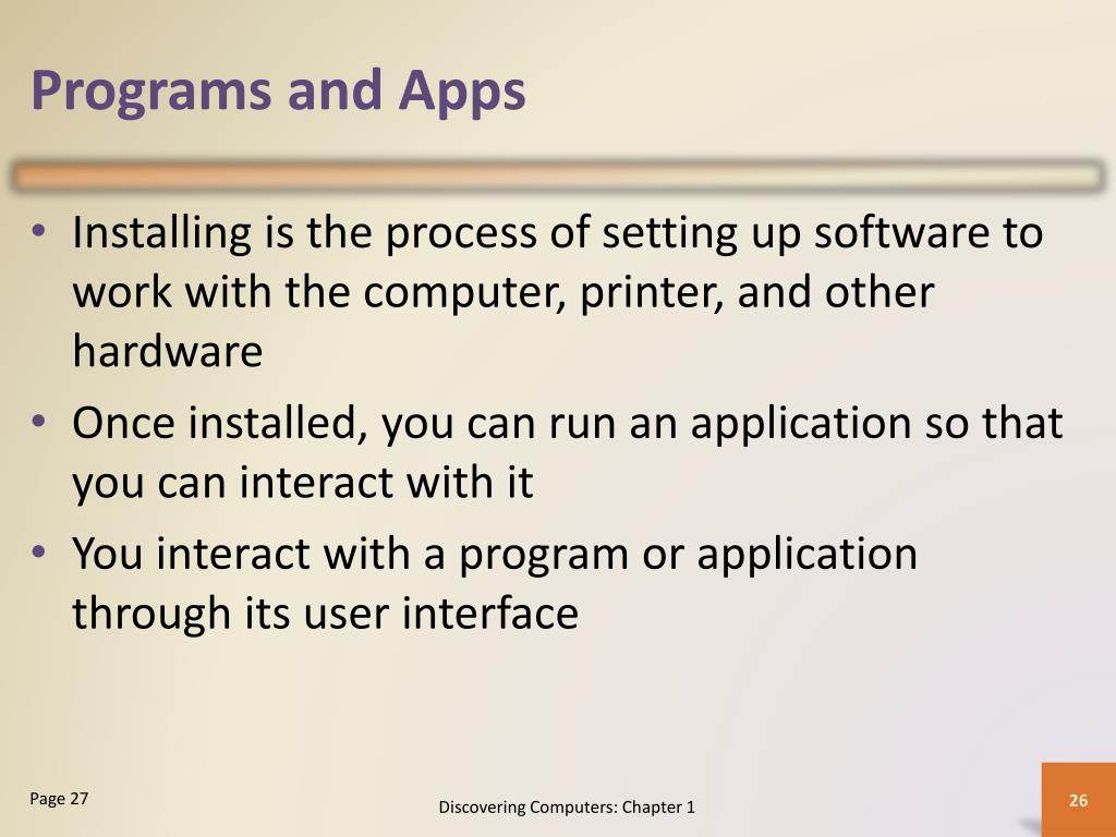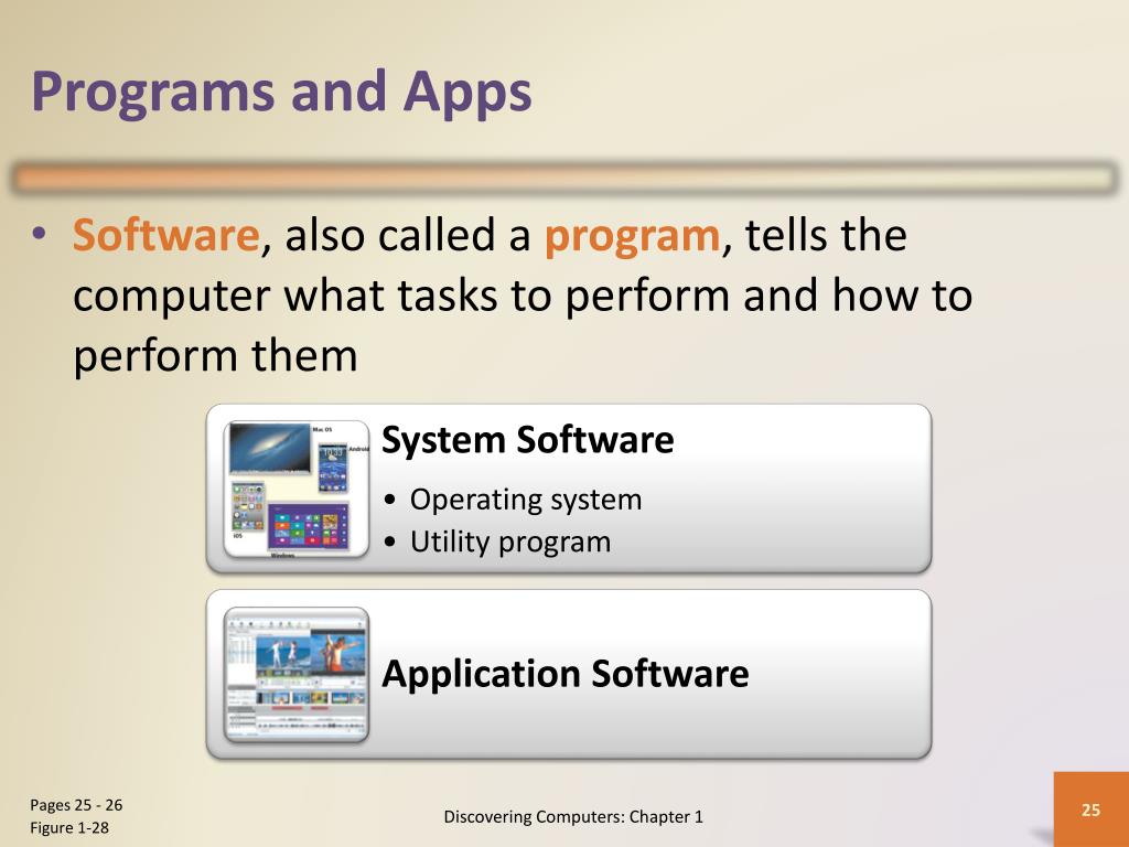 Programs and Apps • Software, also called a program, tells the computer what tasks to perform and how to perform them Discovering Computers: Chapter 1 Pages 25 - 26 Figure 1-28