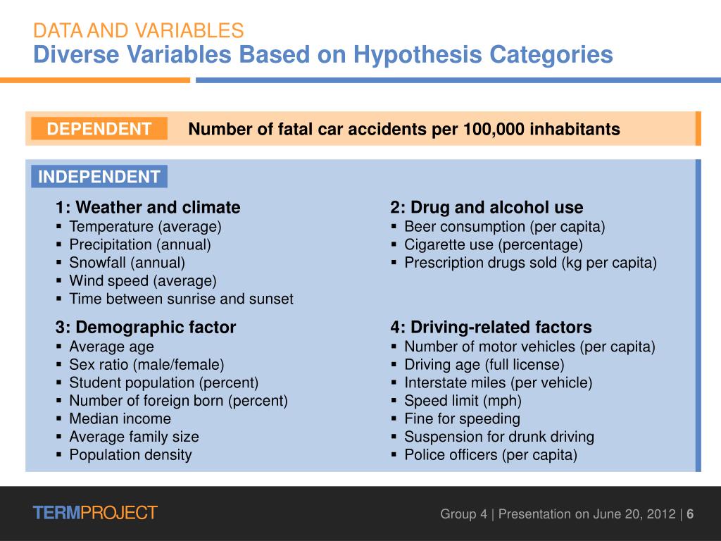 Data and VariablesDiverse Variables Based on Hypothesis Categories Number of fatal car accidents per 100,000 inhabitants DEPENDENT INDEPENDENT • 1: Weather and climate • Temperature (average) • Precipitation (annual) • Snowfall (annual) • Wind speed (average) • Time between sunrise and sunset • 2: Drug and alcohol use • Beer consumption (per capita) • Cigarette use (percentage) • Prescription drugs sold (kg per capita) • 3: Demographic factor • Average age • Sex ratio (male/female) • Student population (percent) • Number of foreign born (percent) • Median income • Average family size • Population density • 4: Driving-related factors • Number of motor vehicles (per capita) • Driving age (full license) • Interstate miles (per vehicle) • Speed limit (mph) • Fine for speeding • Suspension for drunk driving • Police officers (per capita)