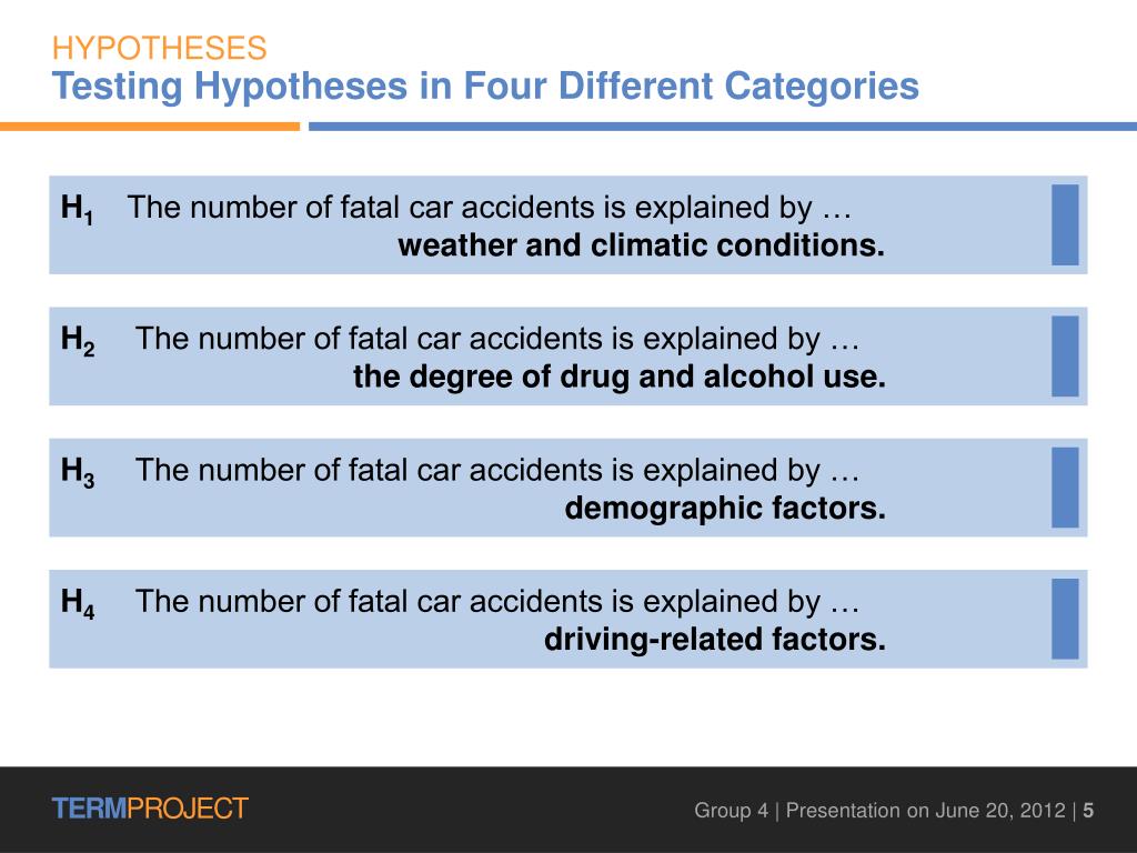 HypothesesTesting Hypotheses in Four Different Categories H1 The number of fatal car accidents is explained by …weather and climatic conditions. H2 The number of fatal car accidents is explained by … the degree of drug and alcohol use. H3 The number of fatal car accidents is explained by … demographic factors. H4 The number of fatal car accidents is explained by … driving-related factors.