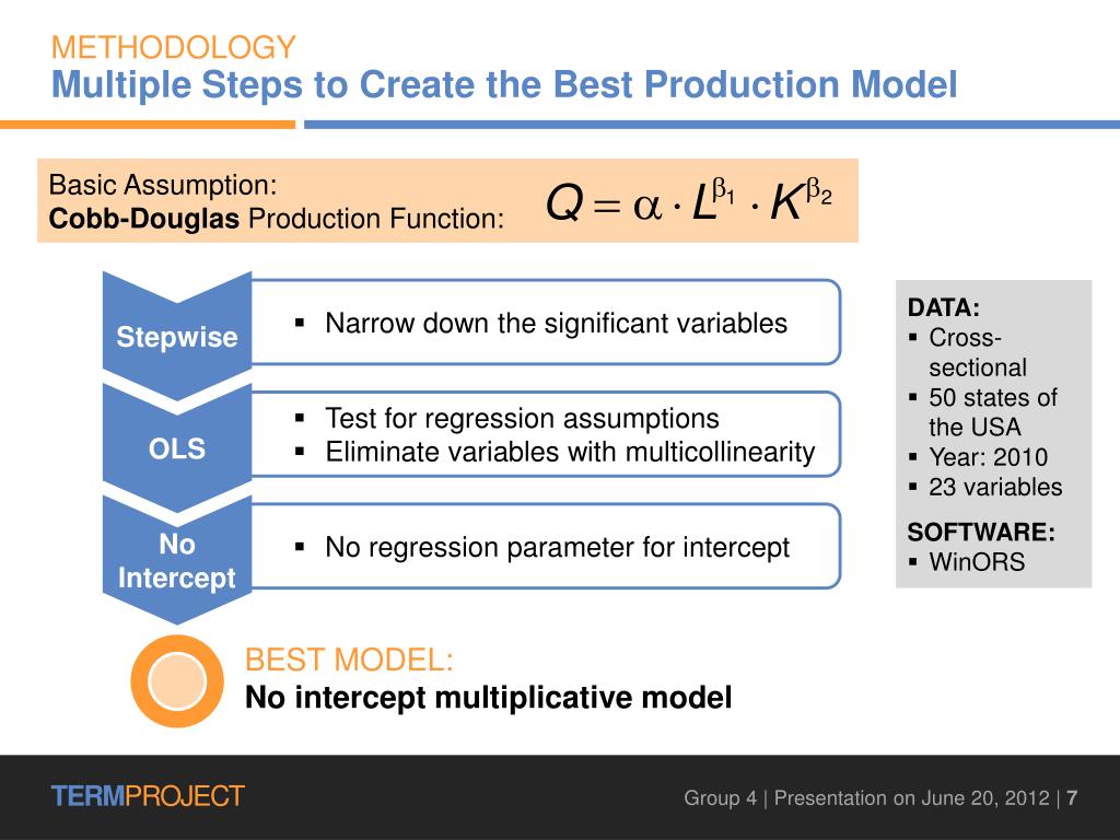 MethodologyMultiple Steps to Create the Best Production Model Basic Assumption: Cobb-Douglas Production Function: Stepwise • Narrow down the significant variables • DATA: • Cross-sectional • 50 states of the USA • Year: 2010 • 23 variables • SOFTWARE: • WinORS OLS • Test for regression assumptions • Eliminate variables with multicollinearity No Intercept • No regression parameter for intercept • BEST MODEL: • No intercept multiplicative model
