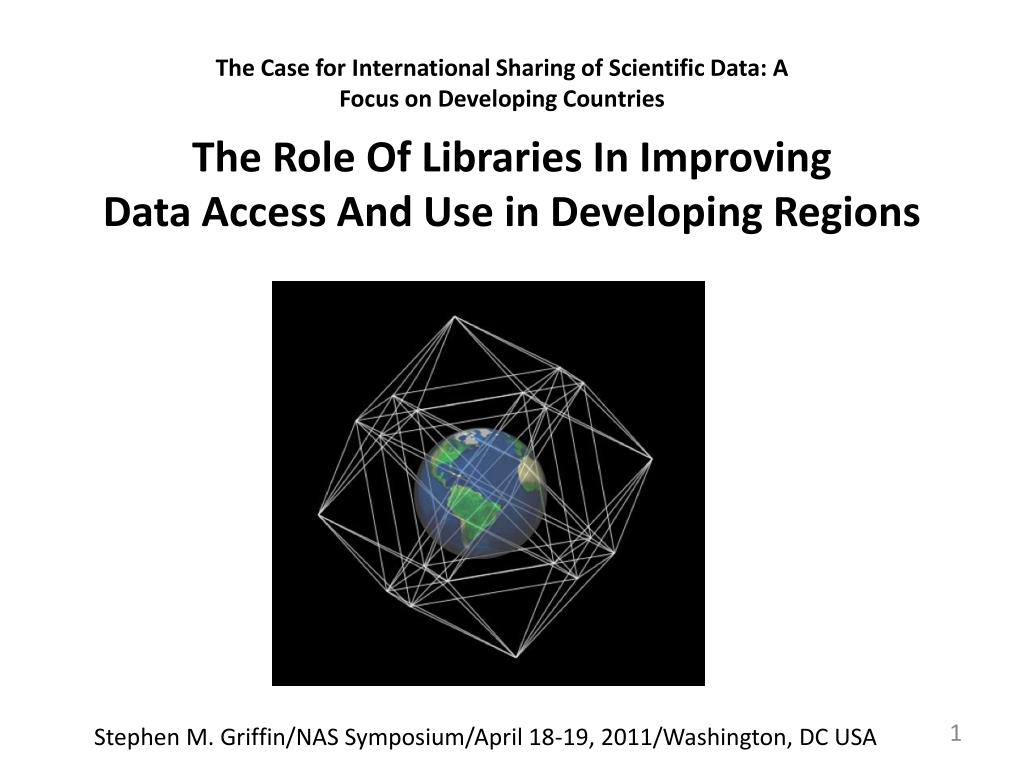 The Role Of Libraries In Improving Data Access And Use in Developing Regions. The Case for International Sharing of Scientific Data: A Focus on Developing Countries. Stephen M. Griffin/NAS Symposium/April 18-19, 2011/Washington, DC USA. Opening Statement. New Methods of Research and