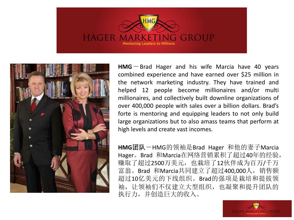 HMG-Brad Hager and his wife Marcia have 40 years combined experience and have earned over $25 million in the network marketing industry. They have trained and helped 12 people become millionaires and/or multi millionaires, and collectively built downline organizations of over 400,000 people with sales over a billion dollars. Brad’s forte is mentoring and equipping leaders to not only build large organizations but to also amass teams that perform at high levels and create vast incomes. HMG团队-HMG的领袖是Brad Hager 和他的妻子Marcia Hager。Brad 和Marcia在网络营销累积了超过40年的经验,赚取了超过2500万美元,也栽培了12伙伴成为百万/千万富翁。Brad 和Marcia共同建立了超过400,000人,销售额超过10亿美元的下线组织。Brad的强项是栽培和提拔领袖,让领袖们不仅建立大型组织,也凝聚和提升团队的执行力,并创造巨大的收入。