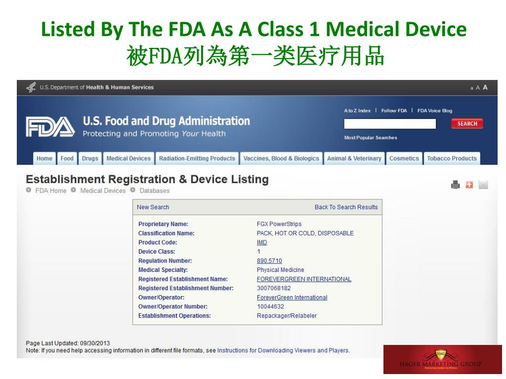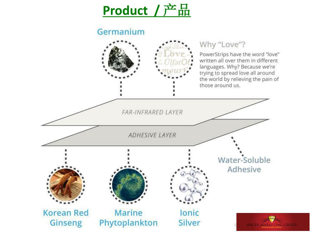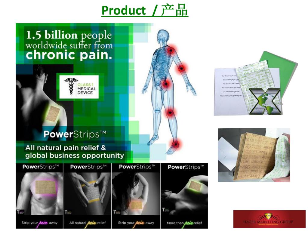 PowerStrip™ We have a PATENTED product called a PowerStrip™, a fusion of modern energy and ancient herbs. When worn (like a patch) the PowerStrips™ are proven to relieve ALL types of bodily pain, including headaches and migraines. This product is listed by the FDA as a Class 1 Medical Device. This has NEVER been done before in network marketing. We are the FIRST. 能量贴 我们拥有一个称为能量贴,融合了现代和古老草药的专利产品。能量贴协助生活在疼痛中的人,人们可以使用能量贴舒缓身体疼痛,包括所有类型的头痛和偏头痛。本产品被FDA列為第一类医疗用品。这是从来没有在网络营销行业发生过的,我们是史上第一家。