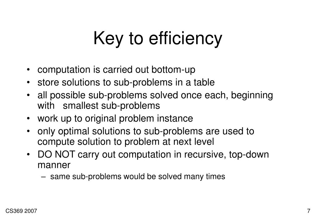 Key to efficiency • computation is carried out bottom-up • store solutions to sub-problems in a table • all possible sub-problems solved once each, beginning with smallest sub-problems • work up to original problem instance • only optimal solutions to sub-problems are used to compute solution to problem at next level • DO NOT carry out computation in recursive, top-down manner • same sub-problems would be solved many times CS369 2007