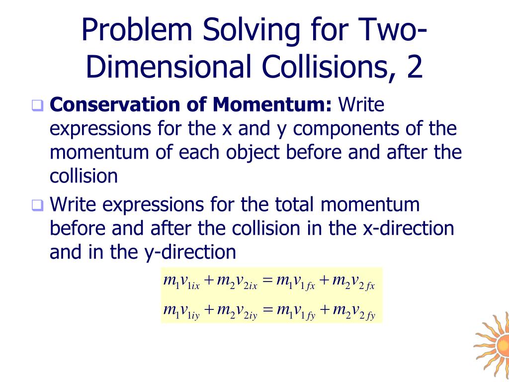 Problem Solving for Two-Dimensional Collisions, 2 • Conservation of Momentum: Write expressions for the x and y components of the momentum of each object before and after the collision • Write expressions for the total momentum before and after the collision in the x-direction and in the y-direction