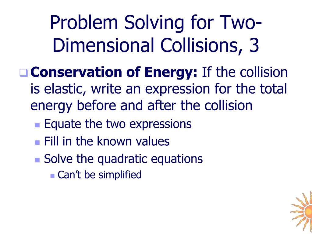 Problem Solving for Two-Dimensional Collisions, 3 • Conservation of Energy: If the collision is elastic, write an expression for the total energy before and after the collision • Equate the two expressions • Fill in the known values • Solve the quadratic equations • Can’t be simplified