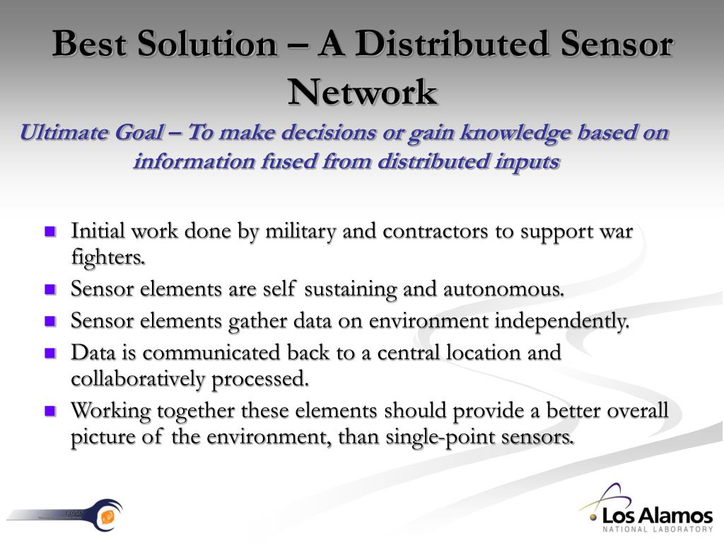 Best Solution – A Distributed Sensor Network Ultimate Goal –To make decisions or gain knowledge based on information fused from distributed inputs • Initial work done by military and contractors to support war fighters. • Sensor elements are self sustaining and autonomous. • Sensor elements gather data on environment independently. • Data is communicated back to a central location and collaboratively processed. • Working together these elements should provide a better overall picture of the environment, than single-point sensors.