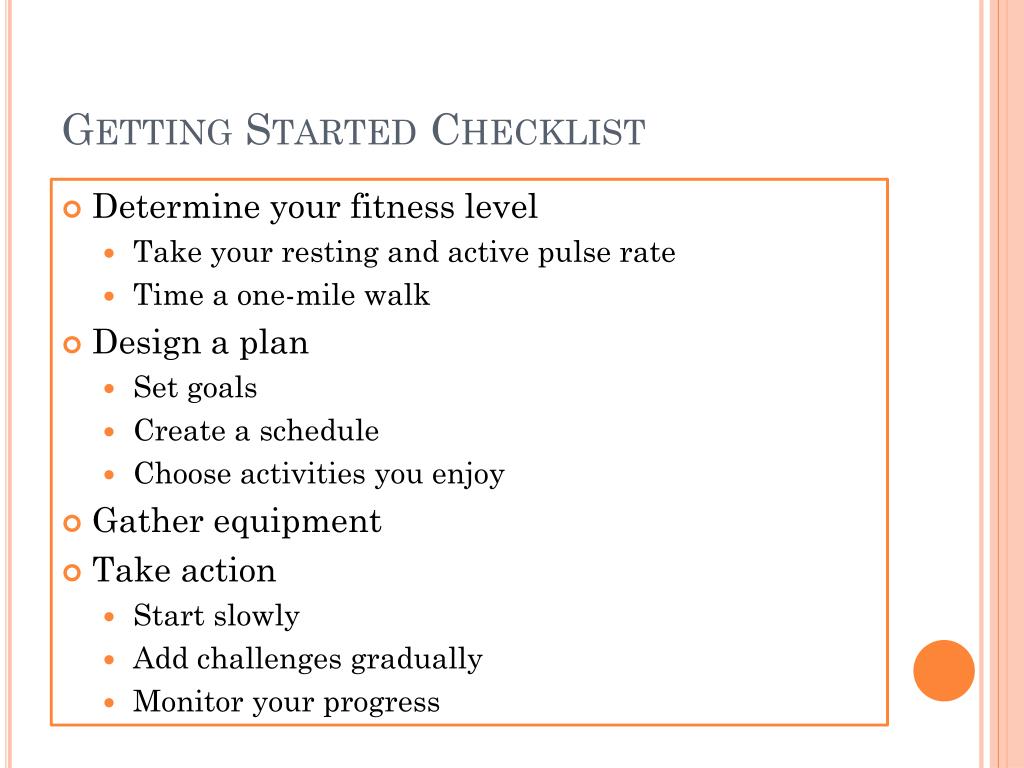 Getting Started Checklist • Determine your fitness level • Take your resting and active pulse rate • Time a one-mile walk • Design a plan • Set goals • Create a schedule • Choose activities you enjoy • Gather equipment • Take action • Start slowly • Add challenges gradually • Monitor your progress