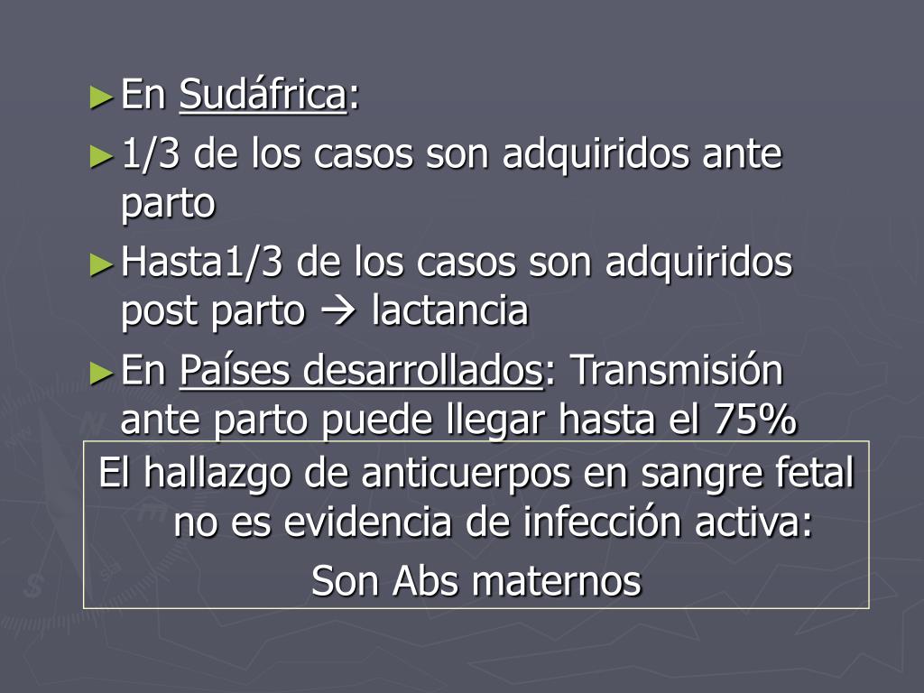 En Sudáfrica: • 1/3 de los casos son adquiridos ante parto • Hasta1/3 de los casos son adquiridos post parto lactancia • En Países desarrollados: Transmisión ante parto puede llegar hasta el 75% El hallazgo de anticuerpos en sangre fetal no es evidencia de infección activa: Son Abs maternos