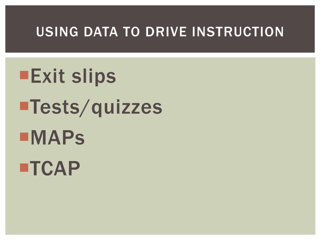 Using data to drive instruction • Exit slips • Tests/quizzes • MAPs • TCAP