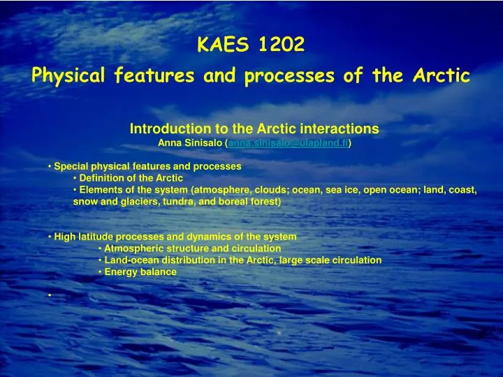 Photo: Eija Kärkäs KAES 1202 Physical features and processes of the Arctic • Introduction to the Arctic interactions • Anna Sinisalo (anna.sinisalo@ulapland.fi) • Special physical features and processes • Definition of the Arctic • Elements of the system (atmosphere, clouds; ocean, sea ice, open ocean; land, coast, snow and glaciers, tundra, and boreal forest) • High latitude processes and dynamics of the system • Atmospheric structure and circulation • Land-ocean distribution in the Arctic, large scale circulation • Energy balance