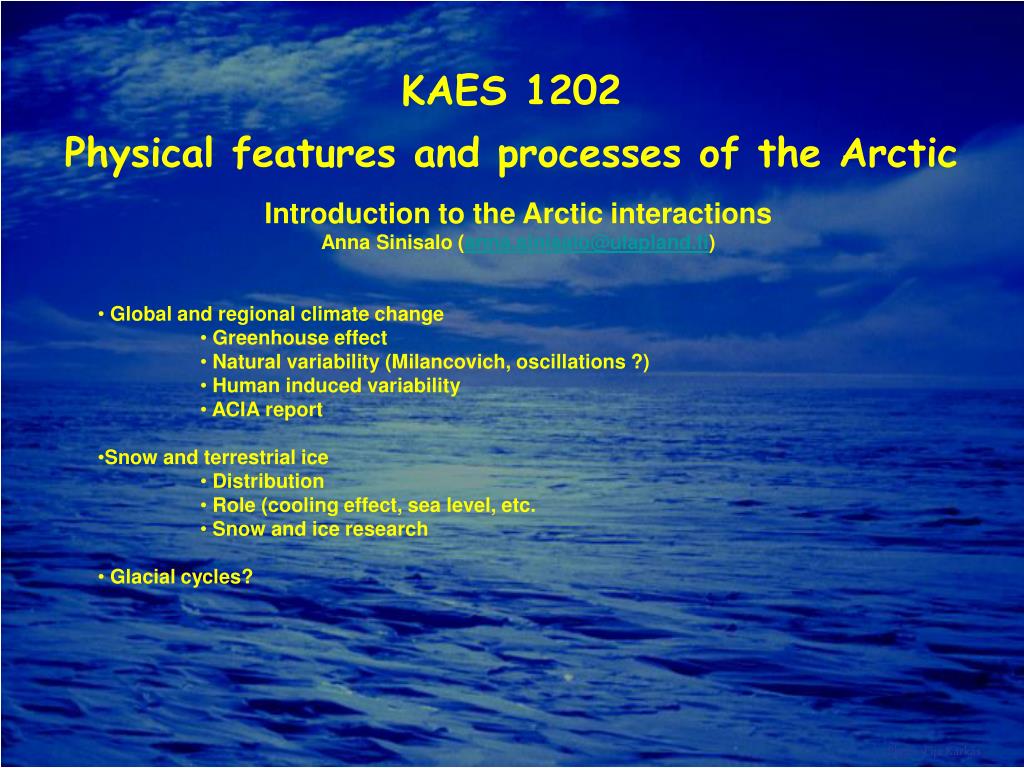 Photo: Eija Kärkäs KAES 1202 Physical features and processes of the Arctic • Introduction to the Arctic interactions • Anna Sinisalo (anna.sinisalo@ulapland.fi) • Global and regional climate change • Greenhouse effect • Natural variability (Milancovich, oscillations ?) • Human induced variability • ACIA report • Snow and terrestrial ice • Distribution • Role (cooling effect, sea level, etc. • Snow and ice research • Glacial cycles?