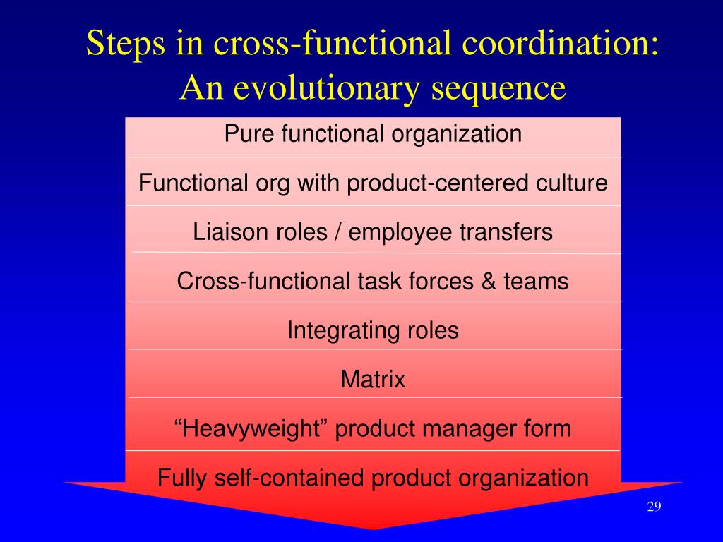 Steps in cross-functional coordination:An evolutionary sequence Pure functional organization Functional org with product-centered culture Liaison roles / employee transfers Cross-functional task forces & teams Integrating roles Matrix “Heavyweight” product manager form Fully self-contained product organization