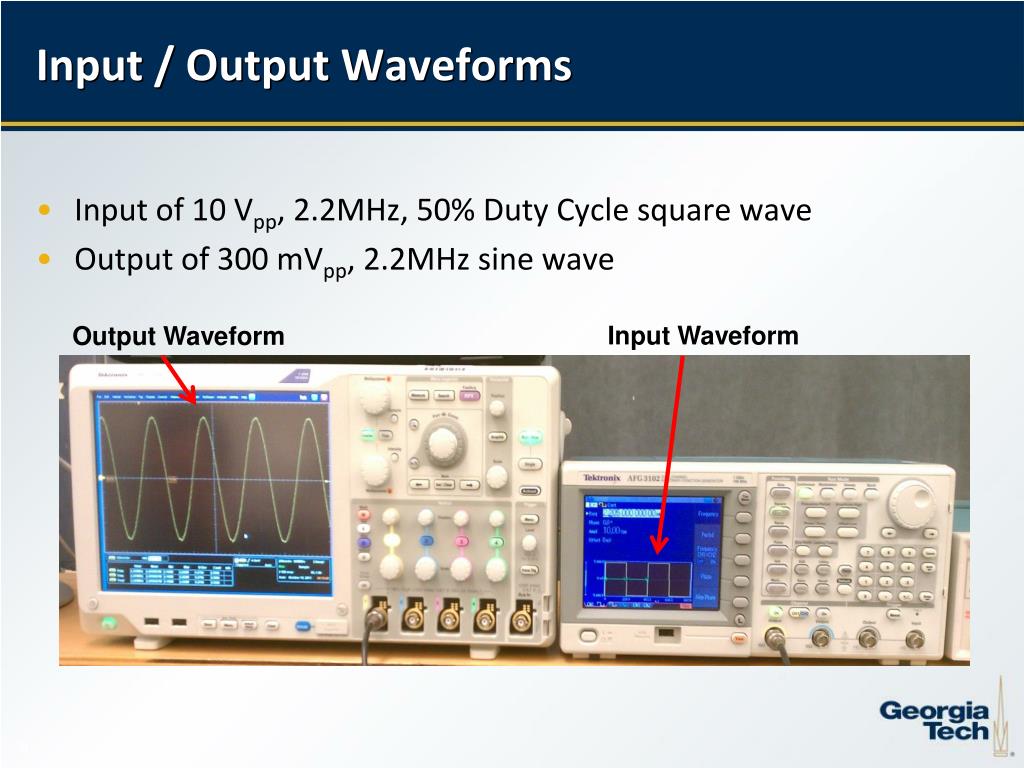 Input / Output Waveforms • Input of 10 Vpp,2.2MHz, 50% Duty Cycle square wave • Output of 300 mVpp, 2.2MHz sine wave Input Waveform Output Waveform