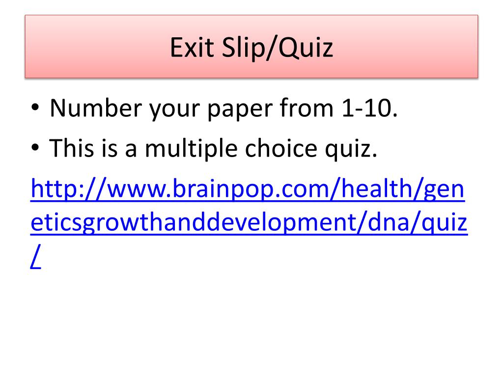 Exit Slip/Quiz • Number your paper from 1-10. • This is a multiple choice quiz. http://www.brainpop.com/health/geneticsgrowthanddevelopment/dna/quiz/