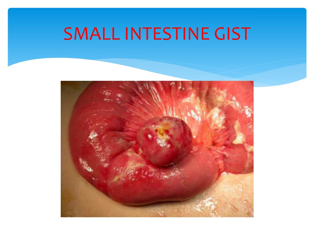 TUMOURS OF THE SMALL INTESTINE GASTRO INTESTINAL STROMAL TUMOURS (GIST) Arise from GI Stroma cells (Intersticial cells of Cajal) (NB. Ramon y Cajal, Spanish Histologist, 1852-1934) Sites: 60-70% in Stomach 25-35% in Small intestine (no prevalence) More GI bleeding than other small intestine malignancy Treatment: Wide local surgical excision with the lymph nodes