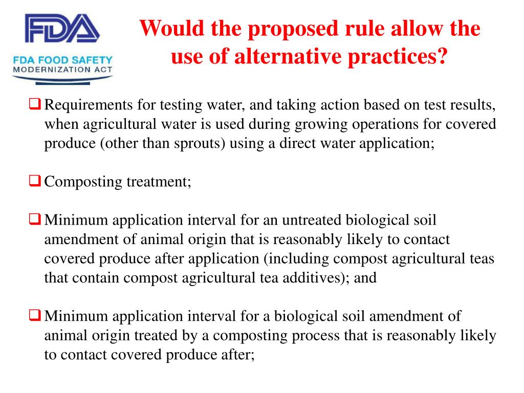 Would the proposed rule allow the use of alternative practices? • Requirements for testing water, and taking action based on test results, when agricultural water is used during growing operations for covered produce (other than sprouts) using a direct water application; • Composting treatment; • Minimum application interval for an untreated biological soil amendment of animal origin that is reasonably likely to contact covered produce after application (including compost agricultural teas that contain compost agricultural tea additives); and • Minimum application interval for a biological soil amendment of animal origin treated by a composting process that is reasonably likely to contact covered produce after;