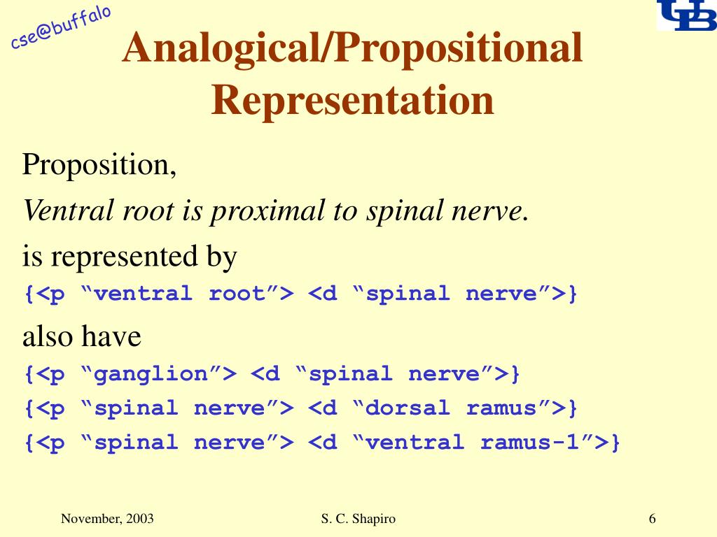 Analogical/PropositionalRepresentation Proposition, Ventral root is proximal to spinal nerve. is represented by {<p “ventral root”> <d “spinal nerve”>} also have {<p “ganglion”> <d “spinal nerve”>} {<p “spinal nerve”> <d “dorsal ramus”>} {<p “spinal nerve”> <d “ventral ramus-1”>} S. C. Shapiro