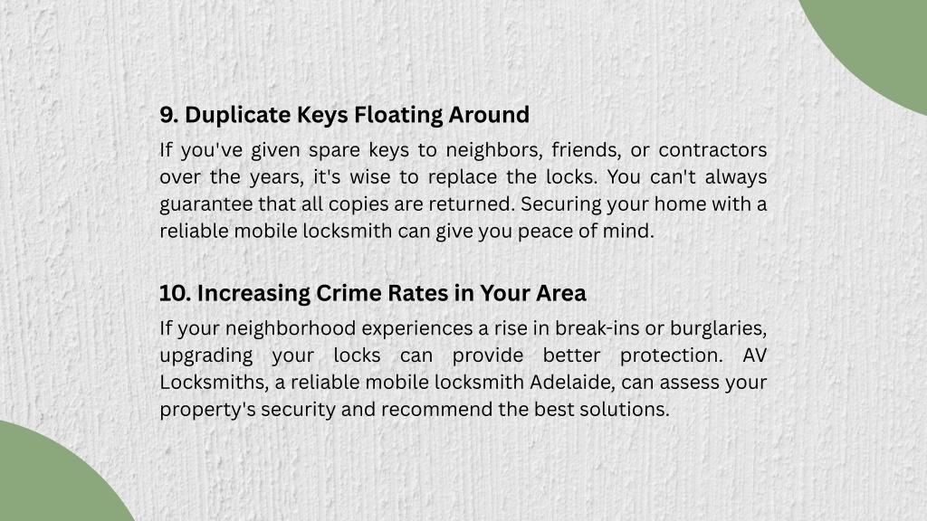9. Duplicate Keys Floating Around If you've given spare keys to neighbors, friends, or contractors over the years, it's wise to replace the locks. You can't always guarantee that all copies are returned. Securing your home with a reliable mobile locksmith can give you peace of mind. 10. Increasing Crime Rates in Your Area If your neighborhood experiences a rise in break-ins or burglaries, upgrading your locks can provide better protection. AV Locksmiths, a reliable mobile locksmith Adelaide, can assess your property's security and recommend the best solutions.