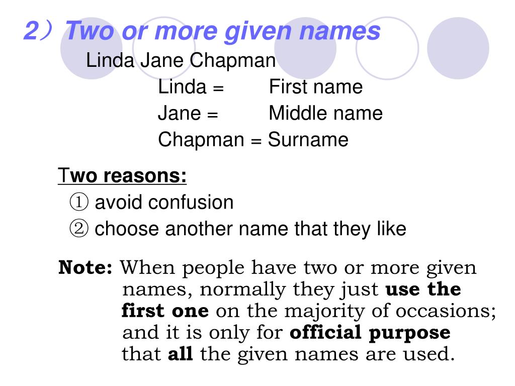 2)Two or more given names Linda Jane Chapman Linda = First name Jane = Middle name Chapman = Surname Two reasons: ① avoid confusion ② choose another name that they like Note: When people have two or more given names, normally they just use the first one on the majority of occasions; and it is only for official purpose that all the given names are used.
