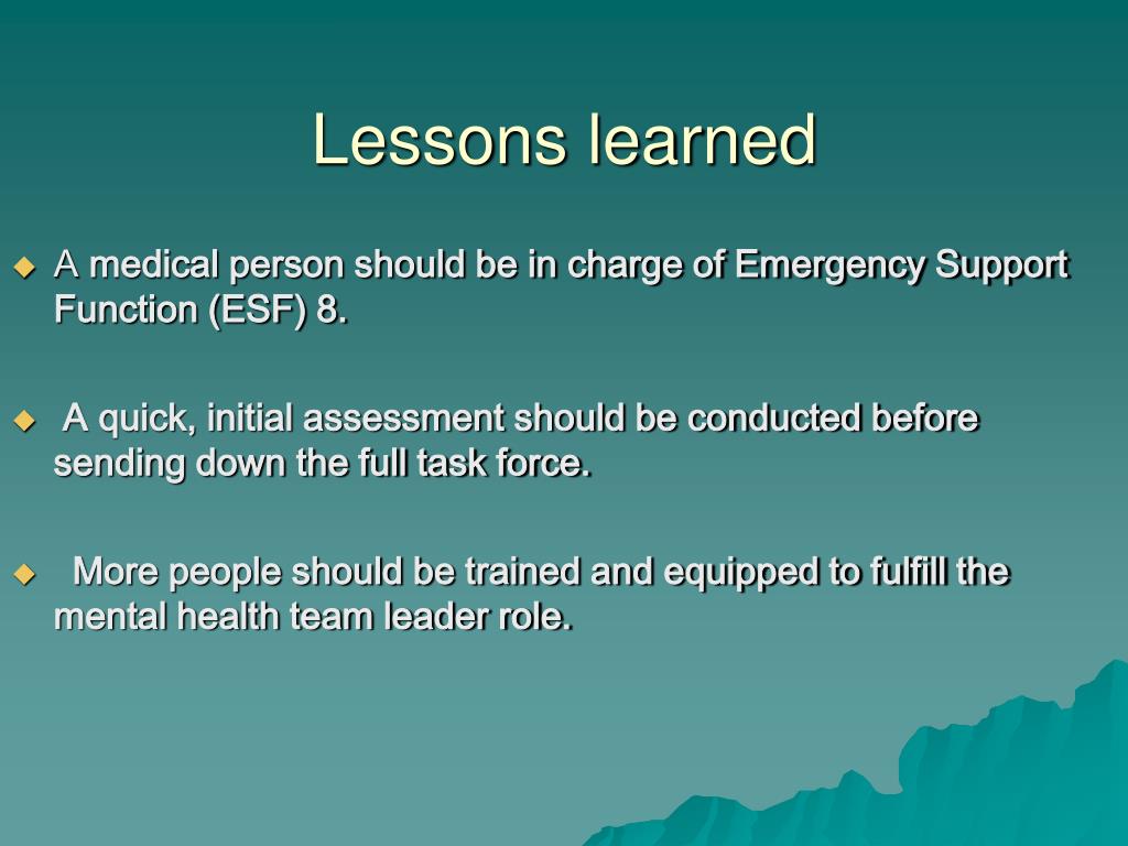 Lessons learned • A medical person should be in charge of Emergency Support Function (ESF) 8. • A quick, initial assessment should be conducted before sending down the full task force. • More people should be trained and equipped to fulfill the mental health team leader role.