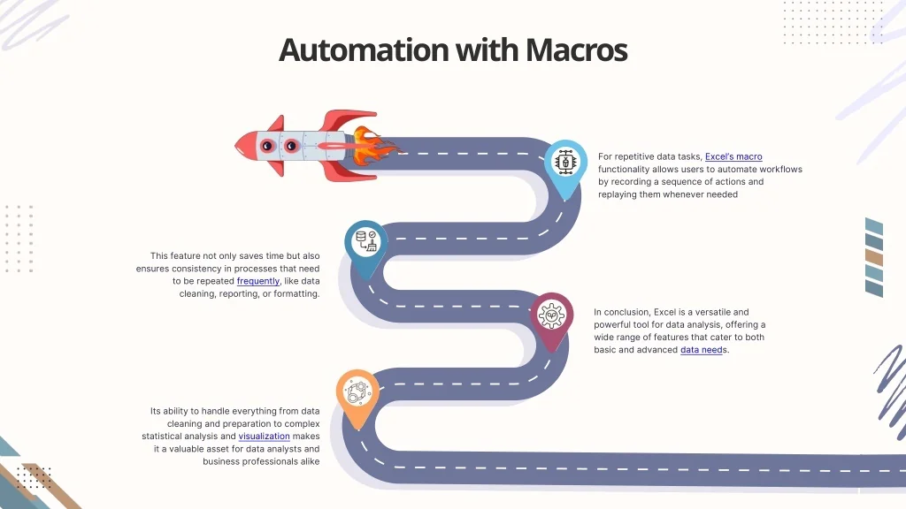 Automation with Macros For repetitive data tasks, Excel’s macro functionality allows users to automate workflows by recording a sequence of actions and replaying them whenever needed This feature not only saves time but also ensures consistency in processes that need to be repeated frequently, like data cleaning, reporting, or formatting. In conclusion, Excel is a versatile and powerful tool for data analysis, offering a wide range of features that cater to both basic and advanced data needs. Its ability to handle everything from data cleaning and preparation to complex statistical analysis and visualization makes it a valuable asset for data analysts and business professionals alike