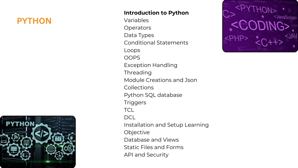 Introduction to Python Variables Operators Data Types Conditional Statements Loops OOPS Exception Handling Threading Module Creations and Json Collections Python SQL database Triggers TCL DCL Installation and Setup Learning Objective Database and Views Static Files and Forms API and Security PYTHON